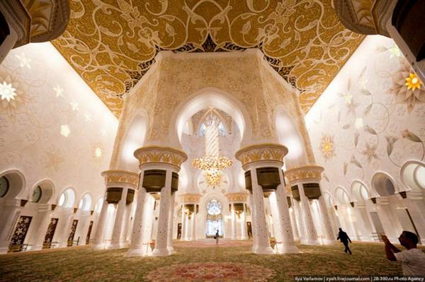 The four corners of the mosque are four minarets that rise approximately 115 meters. Outer row of the main building covers 57 domes. Dome decorated with white marble, their interior decoration is also made of marble.The construction has been spent over 600 million euros.A courtyard paved with colored marble and a population of about seventeen thousand square meters.It is worth noting that the huge floral pattern - a mosaic of different sorts of marble.Between the plates of a small gap for water drainage.80 domes, 1096 columns 1996 columns inside the main prayer hall.Carpet spread out on such a large space, is the world's largest carpet was manufactured by "Carpets of Iran" on the image of Iranian artist Ali Khaliq. Area "rug" - 5,627 square feet, and above it worked about 1200 weavers, 20 technicians and 30 working groups. The weight of this carpet is 47 tons - 35 tons of wool and 12 tons of cotton. The structure of the carpet 2,268,000 units.The mosque is the largest chandelier hanging. Seven copper gilt chandeliers were imported from Germany. The largest chandelier has a 10-meter diameter and 15-meter height. Front is also visible Qibla wall. It has a height 23 and width 50 meters and elaborately decorated in such a way as not to distract the worshipers. 99 names (attributes) of Allah are on the wall Qibla using traditional calligraphy Kufi.For interior decoration used white Italian marble, a 24-karat gold, semiprecious stones - lapis lazuli, red agate, amethyst, shell clams, rock crystal, natural pearl.Inside the mosque, let all comers, but because the mosque is an active place of prayer and a Muslim shrine, women should cover their heads. Not allowed to go to the mosque wearing shorts. At the time of prayers tourists kicked out.